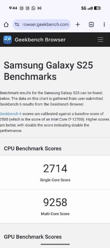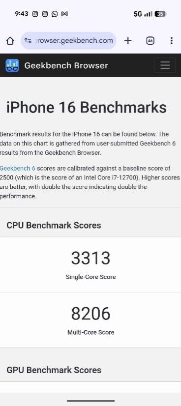 For comparison, the iPhone 16's Geekbench 6 result shows 3313 in single-core and 8206 in multi-core performance. The Samsung Galaxy S25 scores 2714 in single-core and 9258 in multi-core.