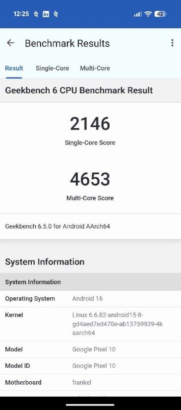 The poor performance of the Pixel 10 can also be seen from its Geekbench 6 tests. I ran a CPU performance test via Geekbench 6, and the device scored 2146 in single-core and 4653 in multi-core performance. These results are significantly lower than those of some of the Pixel 10's competitors, such as the Apple iPhone 16, Samsung Galaxy S25, OnePlus 13, and Nothing Phone 3.