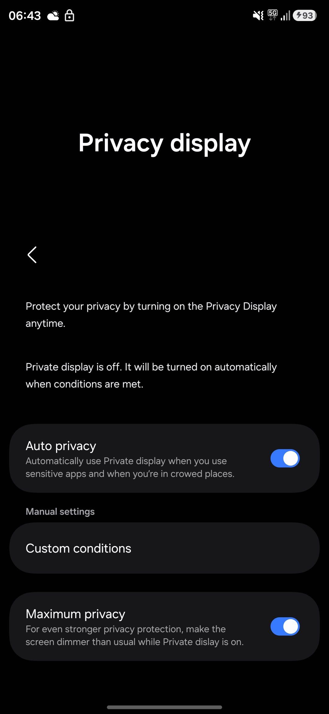 Meanwhile, there’s a toggle for “Maximum privacy,” which essentially makes the display “dimmer than usual” when Privacy display is enabled. As you can probably notice from the screenshots above, some of the text here contains typos, suggesting that we’re looking at an early implementation of this privacy-oriented functionality.